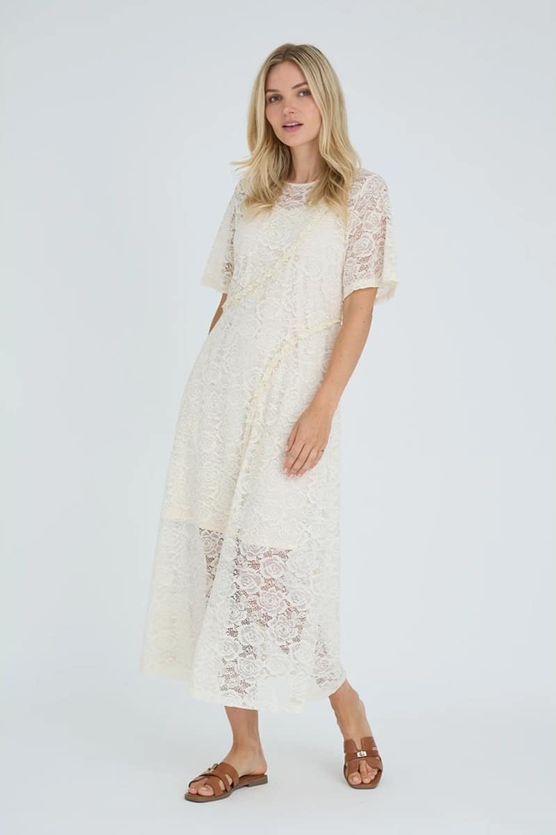En skøn kjole i en smuk blonde fra A-View er kommet i denne knækket hvide farve. Den er med underkjole og derfor er den ikke gennemsigtig. Den er løs i pasformen og kan sagtens bruges sammen med en strik til hverdag eller til en fest med en stilet.Â