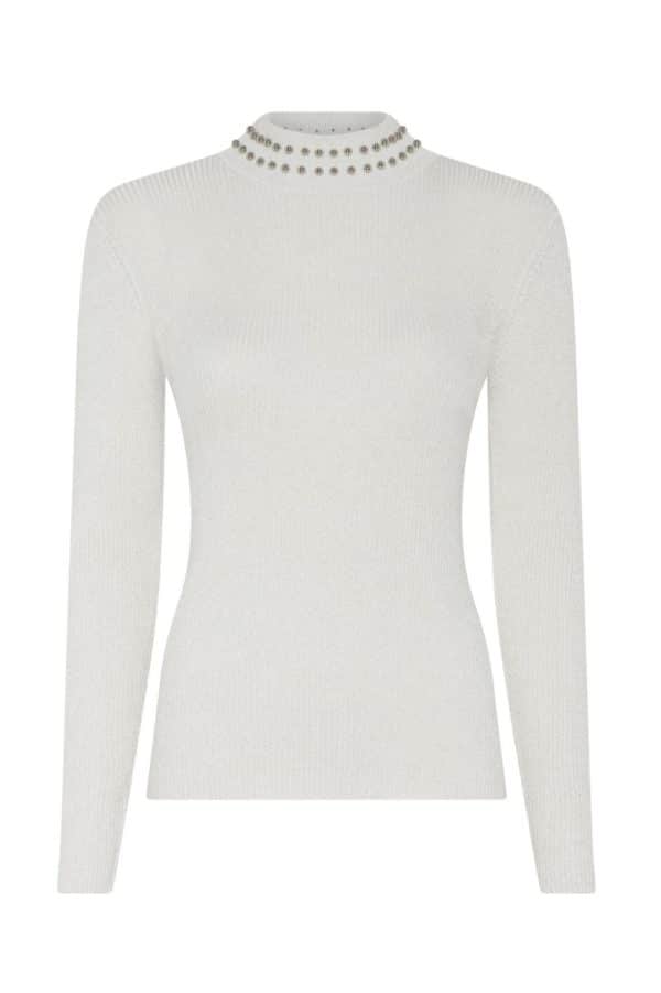 Den perfekte larngærmet med fede detaljer er landet. Denne bluse er fra Bruuns Bazaar og er en flot finstrikket sag med en lille hals med fine perler. Fåes også som kjole i sort