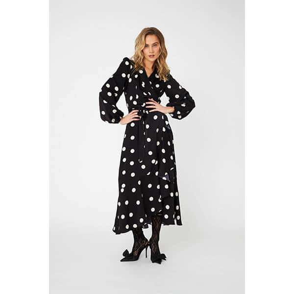 Elegant kjole med polkaprikmønster fra CrÄs Laracras-kjolen forener sofistikeret elegance med et livligt præg. Denne sorte, let draperede maxi-wrapkjole med store hvide polkaprikker udstråler tidløs charme, mens de dekorative flæsedetaljer langs sømmen t
