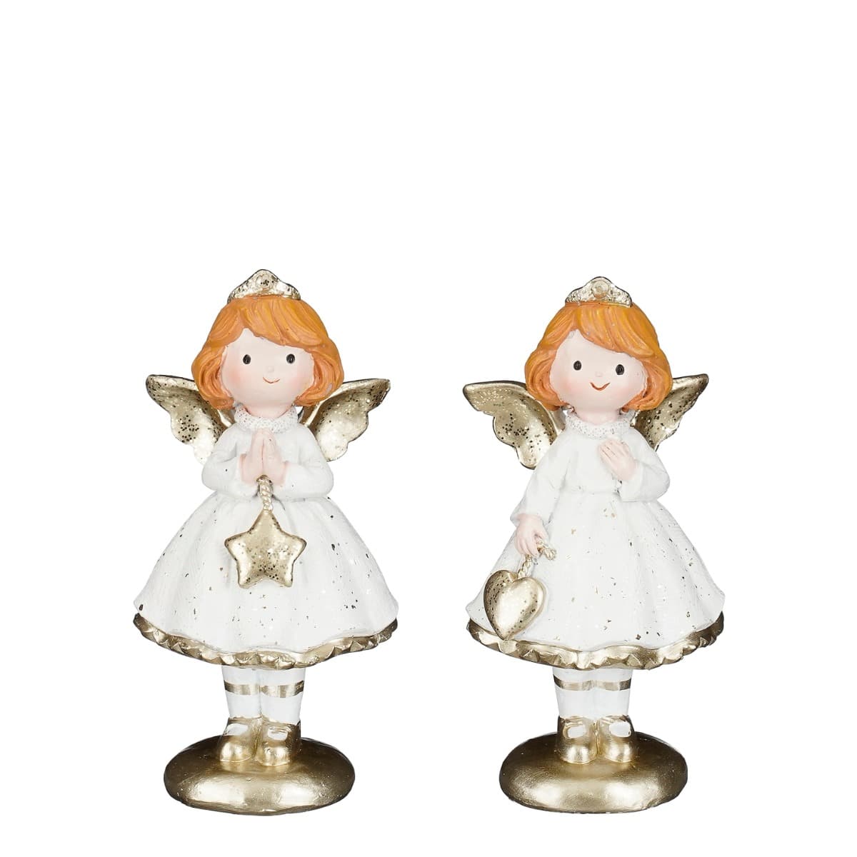 Fine og stemningsfulde englefigurer. Englene er klædt i hvide kjoler med guldfarvede detaljer, elegante diademer og fine englevinger. De har glade og livlige ansigter, der spreder varme og glæde. Hver engel holder enten et hjerte eller en stjerne i hånden