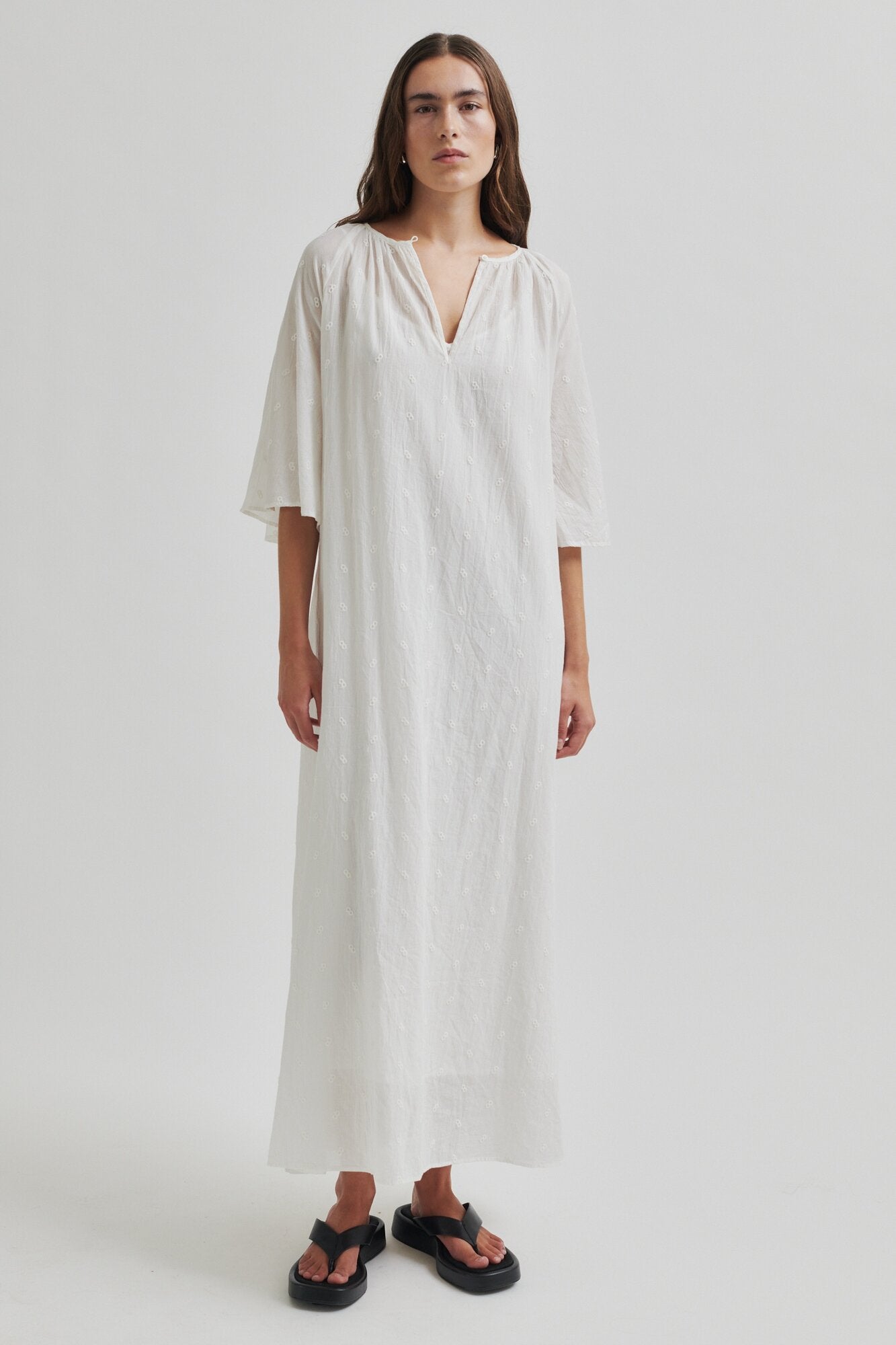 Denne vare udgår af sortiment og sælges til udsolgt. Ericae kjolen er designet i en loose silhuet med v-halsudskæring, 3/4 ærmer og aftageligt bindebånd i taljen. Kjolen har broderet logotegn og kommer med en underkjole.