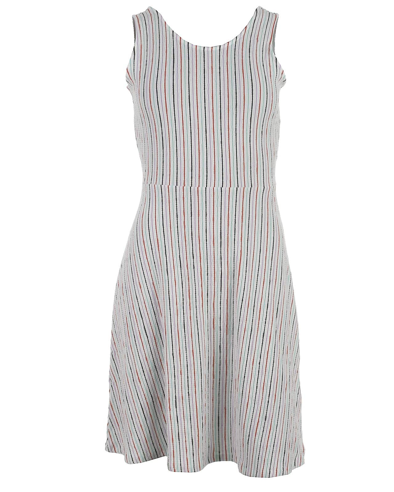 Garcia kjole, offwhiteMærke: GarciaFarve: HvidMateriale: 65% polyester, 33% viscose, 2% elastanVask: 40°Hvid kjole med striber fra GarciaAll-over grøn, rød, lilla og sorte lodrette striberBredde stropperRund hals og rygLogobadge nederst i venstre sideKnæl