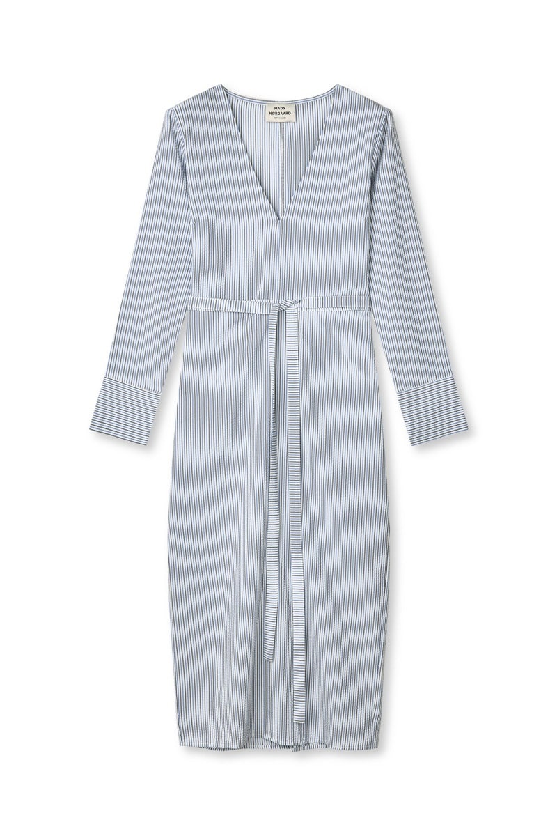 En fin kjole fra Mads Nørgaard er kommet i dette blå og hvid stribet mønster. Den er løs i pasformen og har lange ærmer i også løst snit. Der er bånd i taljen så du kan stramme og skabe figur til dit outfit. Nem til hverdag med sneakers.