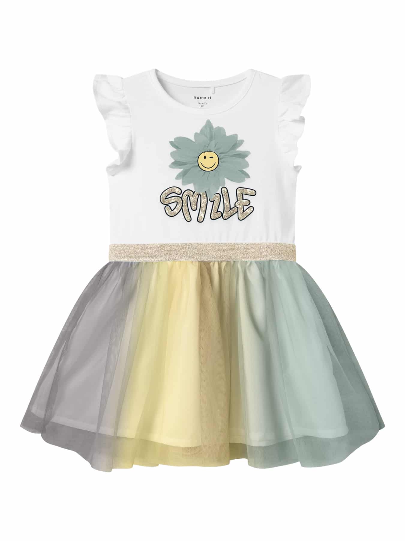 Super sød ballerina kjole fra Name It med en skøn blomst på maven, glimmer detaljer og flæser ved ærmerne.