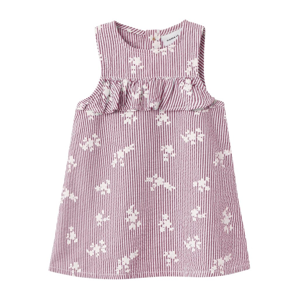 Super sød spencer kjole fra name it. Den er lavet i en lækker kvalitet og så er de med de fineste striber og blomster over det hele. Kjolen er med brede stropper og så har den en flæsekant foran der går henover brystet.