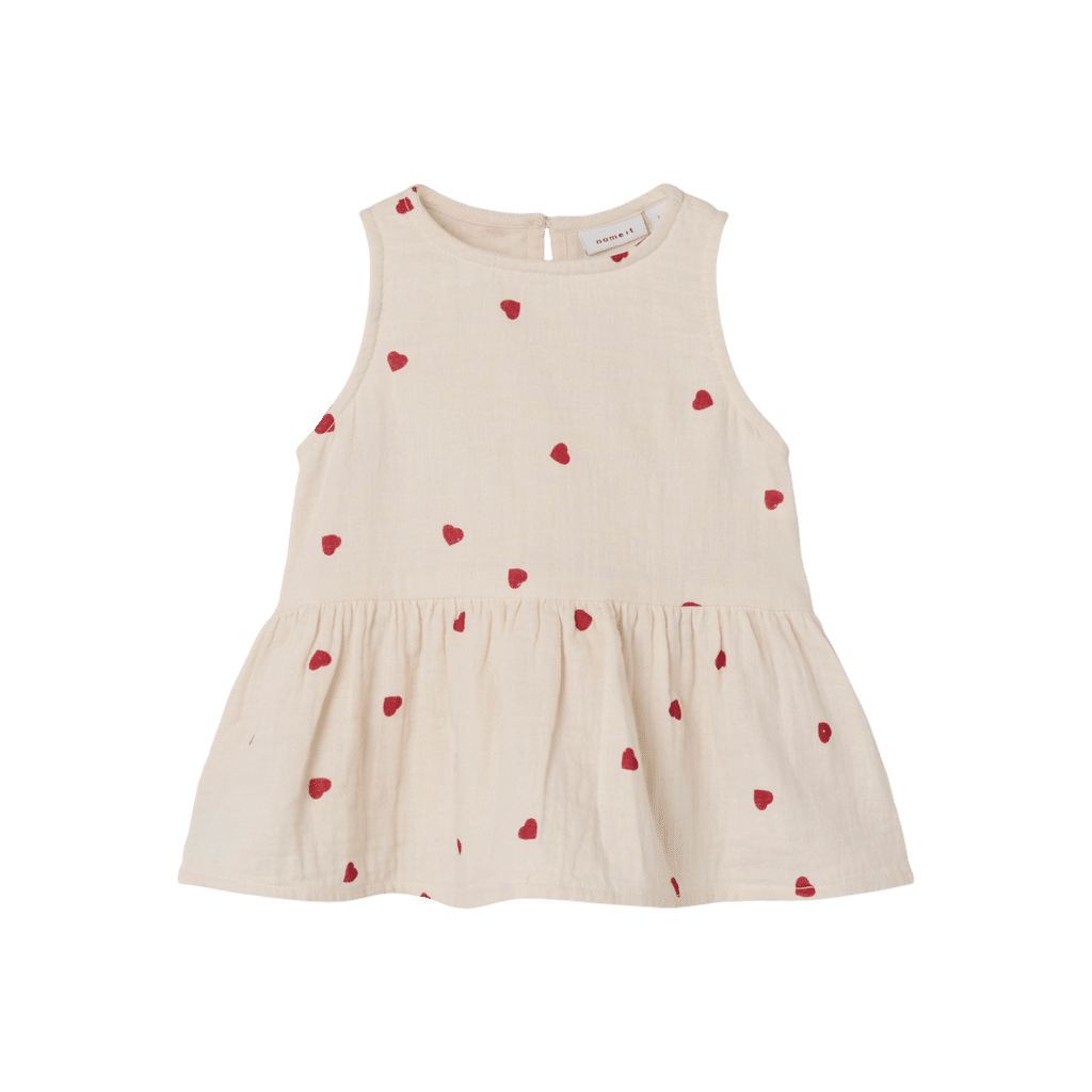 Super smuk ærmeløs spencer kjole fra Name It med rund hals og knaplukning i nakken. Søde små hjerter over det hele og en dejlig cremet bundfarve. Super blød kvalitet!