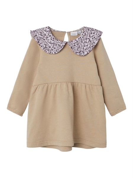 Smukkeste sweat kjole med blomster krave og knap lukning i nakken. 60% bomuld, 40% polyester. Vaskes ved 40 grader.