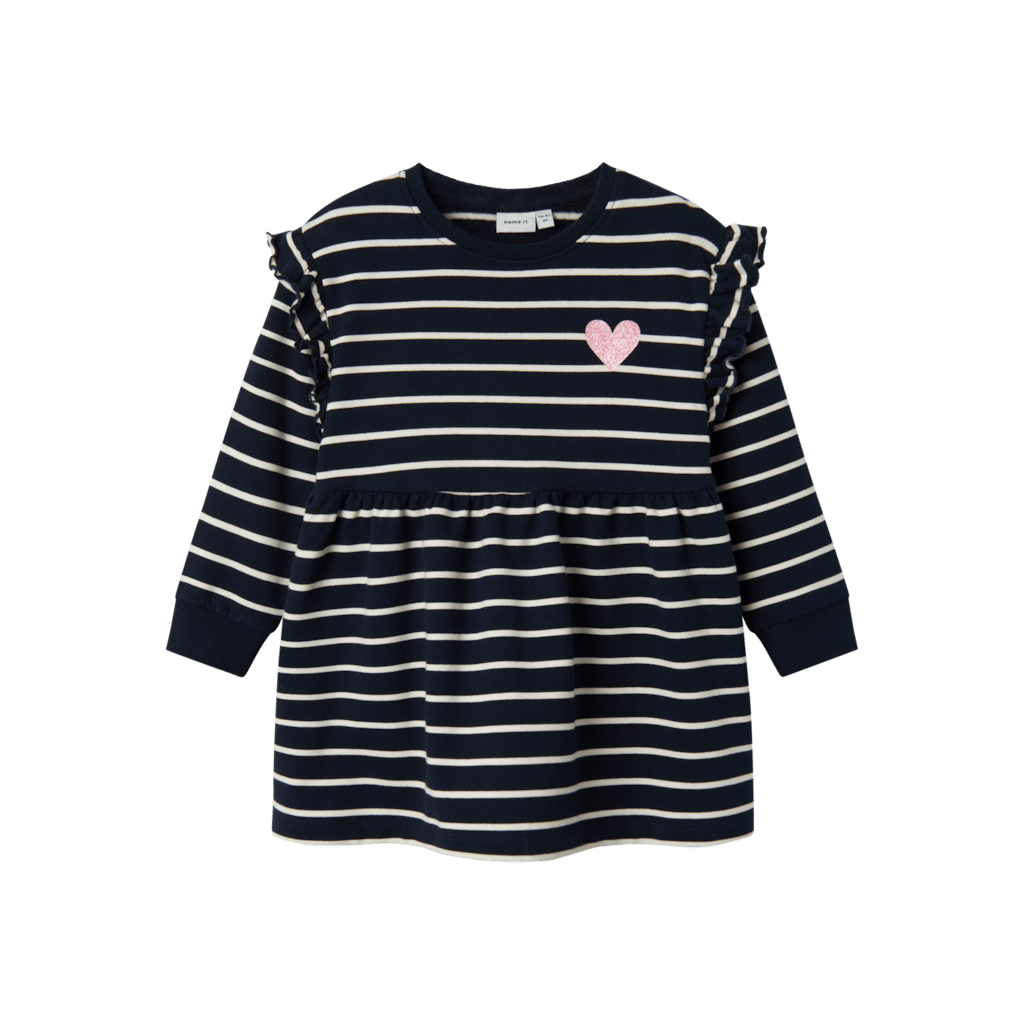 Den fineste kjole fra name it. Den er en flot navy farve med hvide striber og et lille glimmer hjerte på brystet. Kjolen har de fineste flæser ved skulderen.