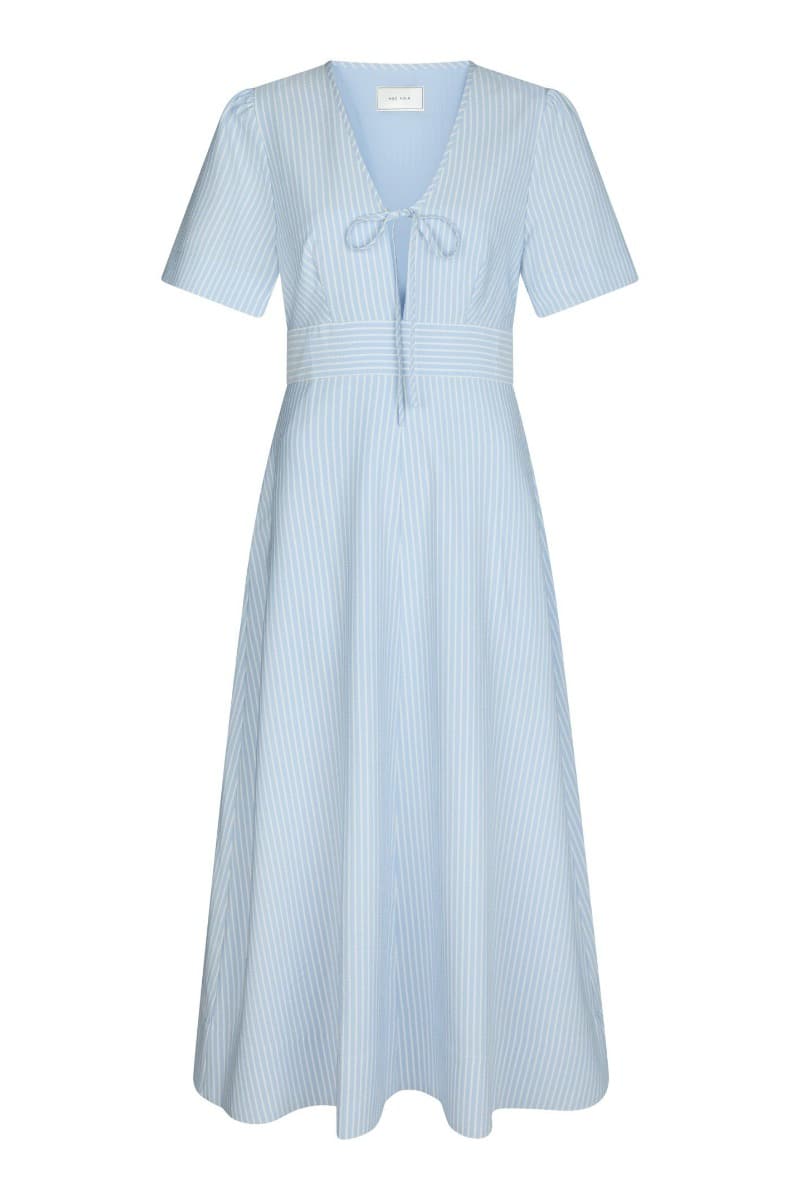 En så smuk og feminin kjole fra Neo Noir i en sød blå og hvid stribe. Denne kjole har korte ærmer, sidder til i taljen og har bindebånd foran. Style den til et par sandaler!