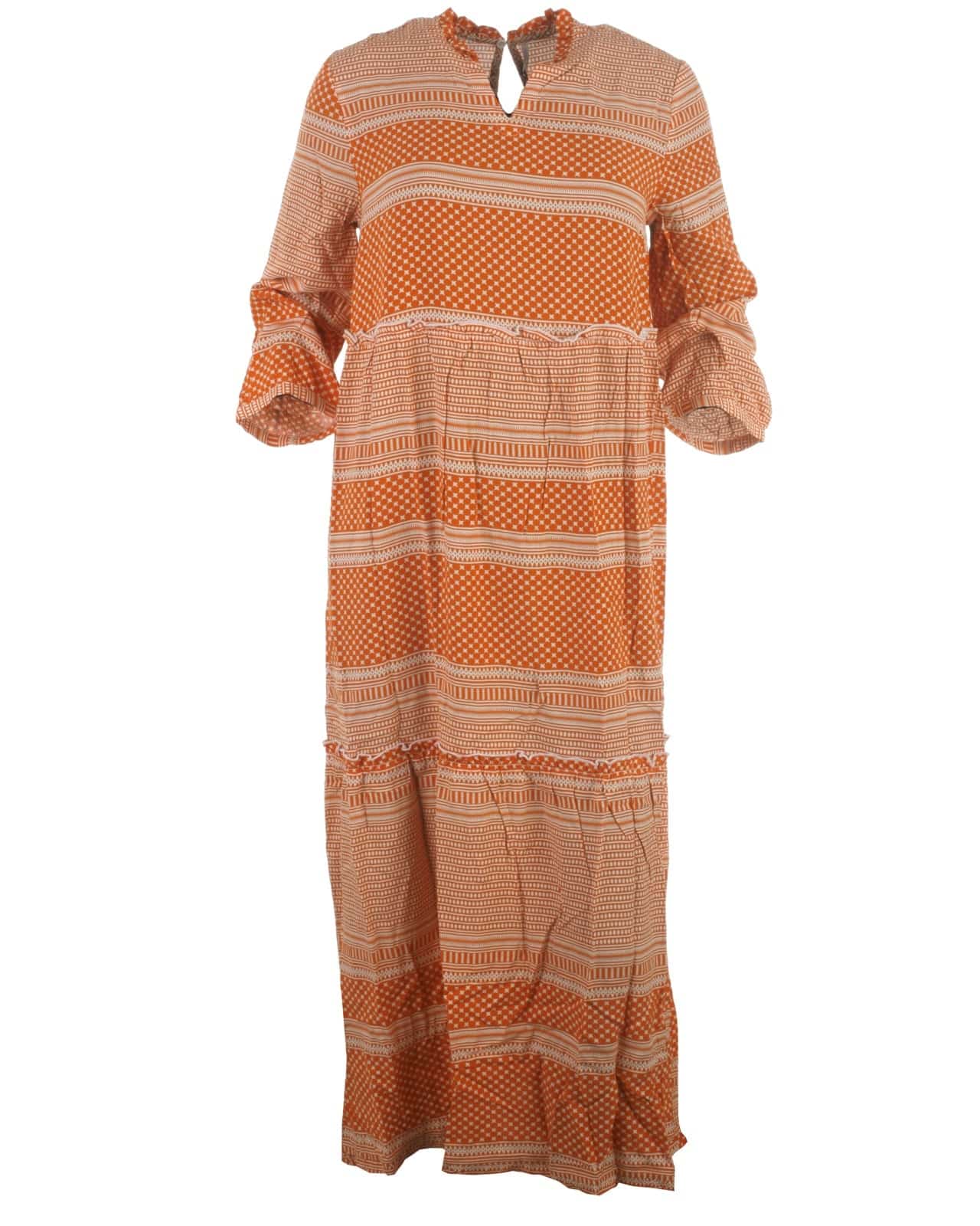Only Kids kjole, Nella, ercuMærke: Only KidsStyle: NellaFarve: OrangeMateriale: 100% viscoseVask: 30°Orange-hvid kjole fra Kids OnlyAll-over hvid og orange mønsterHals med frill effekt og v-snirtSlids i nakken som lukkes med en knap3/4 ærmerVandrette syni