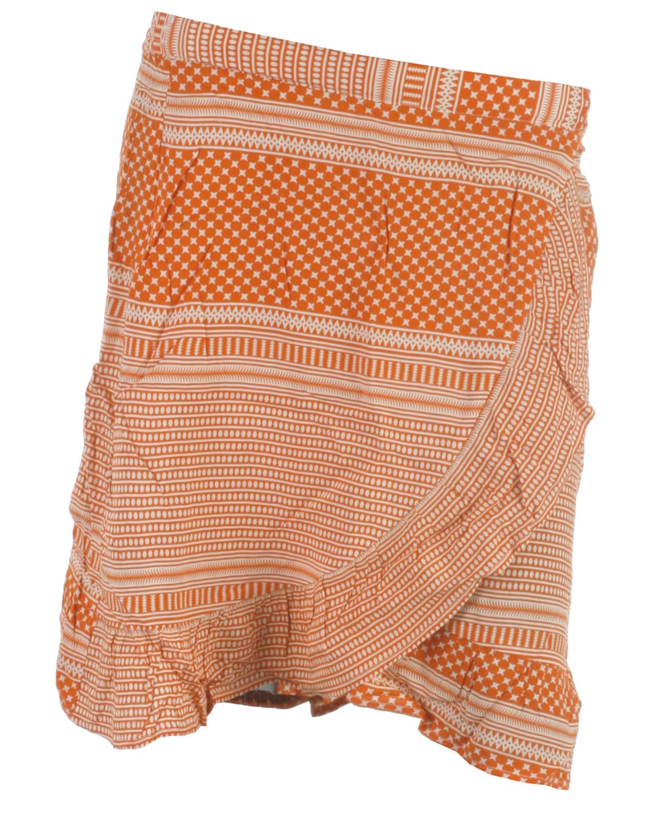 Only Kids skirt, Nella, ercuMærke: Only KidsStyle: NellaFarve: OrangeMateriale: 100% viscoseVask: 30°Orange-hvid nederdel fra Kids OnlyElastik bagved i livetIndvendig justerbar elastik i livetAll-over hvid og orange mønsterSkrå flæse på frontenFlæse ved n