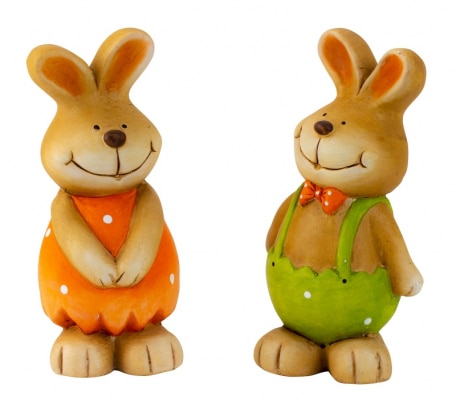 Påskehare. Storsmilende påskeharer findes i 2 varianter enten som pigehare med orange kjole med hvide prikker på eller som drengehare med grønne bukser med seler og orange butterfly på. Påskeharerne måler 17 cm i højden. Fremstillet i keramik.Pakket med 1