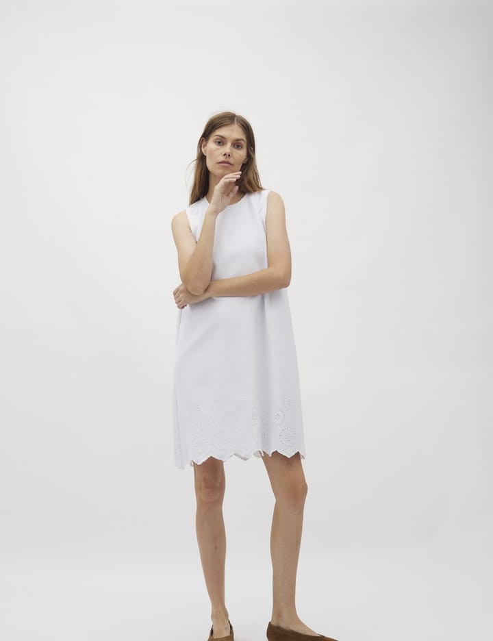 Rhiann Scallop-G fra Global-Funk er den perfekte kjole til varme dage, hvor du ønsker at føle dig let og stilfuld. Denne ærmeløse kjole med en klassisk crewneck-halsudskæring er ideel til både afslappede udflugter og festlige anledninger. Den enkle, men e