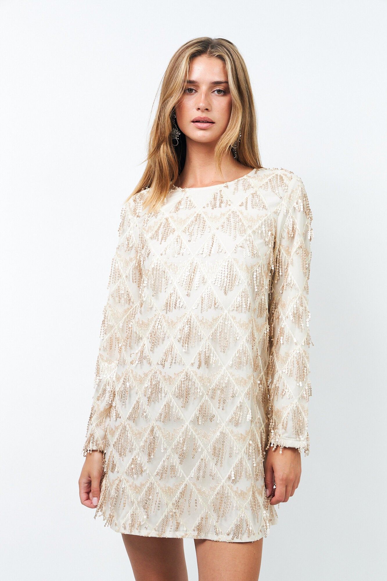 Smuk kjole i hvid med champagne farvet pailetter, som hænger løst på kjolen og giver et festligt look. Kjolen er designet med rund hals, lange ærmer og lukkes med lynlås bagpå.