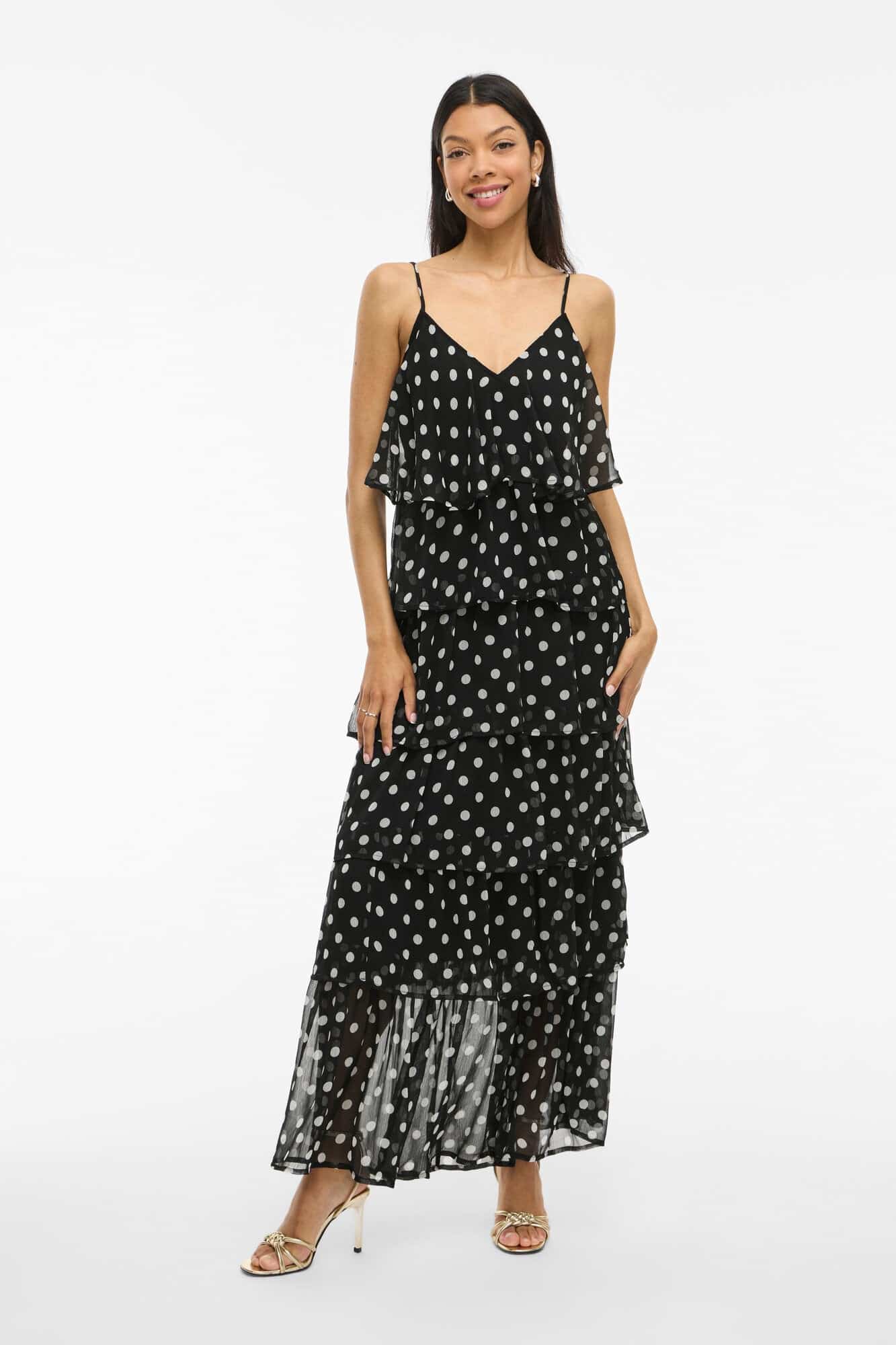 Smuk lagdelt maxikjole i sort med hvide prikker. Kjolen har foret body, v-hals og tynde justerbar stropper og kan styles til både hverdag og festlige begivenheder.