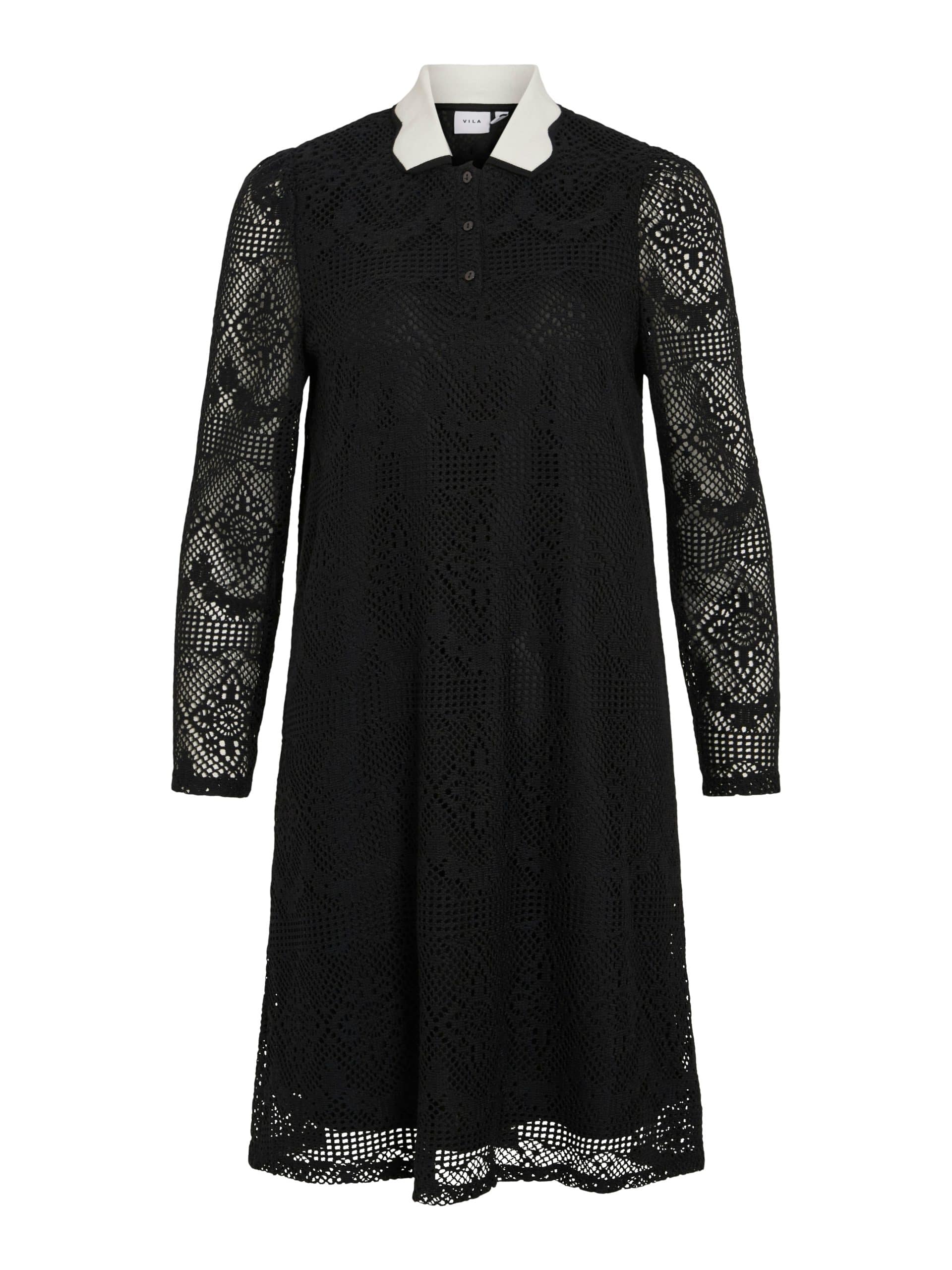 Denne vare udgår af sortiment og sælges til udsolgt. Visara kjolen fra Vila er designet som en skjortekjole med blonder, lange gennemsigtige ærmer og en hvid krave.